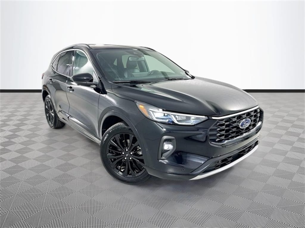 Escape ST-Line Elite, Ford Gold Certified Certified, 4D Sport Utility, EcoBoost 2.0L I4 GTDi DOHC Turbocharged VCT, 8-Speed Automatic, AWD, Agate Black Metallic, Red / Ebony Leather, Active Park Assist 2.0, Black Roof-Rack Side Rails, Equipment Group 501A, HD Radio, Head-Up Display, Heated Leather-Trimmed Front Sport Contour Seats, Navigation system: Connected Navigation, Panoramic Vista Roof, Premium Technology Package, Radio: B&O Sound System by Bang & Olufsen, 2.91 Axle Ratio, 4-Wheel Disc Brakes, 6 Speakers, ABS brakes, Air Conditioning, Alloy wheels, AM/FM radio: SiriusXM, AM/FM Stereo, Auto High-beam Headlights, Auto-dimming Rear-View mirror, Automatic temperature control, Brake assist, Bumpers: body-color, Compass, Delay-off headlights, Driver door bin, Driver vanity mirror, Dual front impact airbags, Dual front side impact airbags, Electronic Fuel Door Release, Electronic Stability Control, Emergency communication system: SYNC 4 911 Assist, Exterior Parking Camera Rear, FordPass Connect, Four wheel independent suspension, Front anti-roll bar, Front Bucket Seats, Front Center Armrest, Front dual zone A/C, Front fog lights, Front reading lights, Fully automatic headlights, Garage door transmitter, Heated door mirrors, Heated front seats, Heated steering wheel, Heated Vinyl/Cloth Front Sport Contour Bucket Seats, Illuminated entry, Knee airbag, Low tire pressure warning, Memory seat, Neutral Towing Capability, Occupant sensing airbag, Outside temperature display, Overhead airbag, Overhead console, Panic alarm, Passenger door bin, Passenger vanity mirror, Pedestrian Alert Sounder, Power door mirrors, Power driver seat, Power Liftgate, Power passenger seat, Power steering, Power windows, Radio data system, Rain sensing wipers, Rear anti-roll bar, Rear reading lights, Rear seat center armrest, Rear window defroster, Rear window wiper, Remote keyless entry, Roof rack: rails only, Security system, Speed control, Speed-sensing steering, Speed-Sensitive Wipers, Split folding rear seat, Spoiler, Sport steering wheel, Steering wheel mounted audio controls, SYNC 4 w/Enhanced Voice Recognition, Tachometer, Telescoping steering wheel, Tilt steering wheel, Traction control, Trip computer, Variably intermittent wipers, Wheels: 19" Ebony-Painted Aluminum, Wheels: 19" Machined-Face Ebony-Painted Aluminum, Escape ST-Line Elite, 4D Sport Utility, EcoBoost 2.0L I4 GTDi DOHC Turbocharged VCT, 8-Speed Automatic, AWD, Agate Black Metallic, Red / Ebony Leather, Active Park Assist 2.0, Black Roof-Rack Side Rails, Equipment Group 501A, HD Radio, Head-Up Display, Heated Leather-