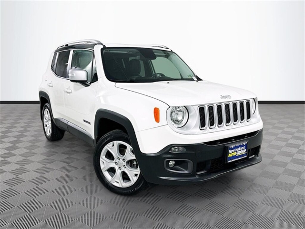 Renegade Limited, Ford Blue Advantage: Blue Certified Certified, 2.4L I4 MultiAir, 4WD, Alpine White, Black Leather, 1 Yr Trial (Registration Required), 5-Year SiriusXM Traffic Service, 5-Year SiriusXM Travel Link Service, 6 Speakers, 6.5" Navigation Group w/Uconnect, 6.5" Touchscreen Display, Air Conditioning, AM/FM radio: SiriusXM, Automatic temperature control, For Details Visit DriveUconnect.com, Front dual zone A/C, GPS Navigation, HD Radio, MOPAR All Weather Mats, MOPAR Bright Door Entry Guards, MOPAR Cargo Tray, MOPAR Interior Protection Package, Quick Order Package 27G, Radio data system, Radio: Uconnect 3 w/5" Display, Radio: Uconnect 6.5 Nav, Rear window defroster, Remote USB Port, SiriusXM Traffic, SiriusXM Travel Link, Uconnect Access, 18" x 7.0" Aluminum Polished Wheels, 18" x 7.0" Aluminum Wheels, 3.734 Axle Ratio, 4-Wheel Disc Brakes, ABS brakes, Alloy wheels, Anti-whiplash front head restraints, Auto-dimming Rear-View mirror, Brake assist, Compass, Delay-off headlights, Driver door bin, Driver vanity mirror, Dual front impact airbags, Dual front side impact airbags, Electronic Stability Control, Four wheel independent suspension, Front anti-roll bar, Front Bucket Seats, Front Center Armrest, Front fog lights, Front reading lights, Fully automatic headlights, Heated door mirrors, Heated front seats, Heated steering wheel, Illuminated entry, Knee airbag, Leather Shift Knob, Leather steering wheel, Leather Trimmed Bucket Seats, Low tire pressure warning, My Sky Power/Removable Sunroof, Normal Duty Suspension, Occupant sensing airbag, Outside temperature display, Overhead airbag, Overhead console, Panic alarm, ParkView Rear Back-Up Camera, Passenger door bin, Passenger vanity mirror, Power door mirrors, Power driver seat, Power steering, Power windows, Rain sensing wipers, Rear anti-roll bar, Rear seat center armrest, Rear window wiper, Remote keyless entry, Roof rack: rails only, Speed control, Split folding rear seat, Spoiler, Steering wheel mounted audio controls, Tachometer, Telescoping steering wheel, Tilt steering wheel, Traction control, Trip computer, Turn signal indicator mirrors, Variably intermittent wipers, Voltmeter, Renegade Limited, 2.4L I4 MultiAir, 4WD, Alpine White, Black Leather, 1 Yr Trial (Registration Required), 5-Year SiriusXM Traffic Service, 5-Year SiriusXM Travel Link Service, 6 Speakers, 6.5" Navigation Group w/Uconnect, 6.5" Touchscreen Display, Air Conditioning, AM/FM radio: SiriusXM, Automatic temperature control, For Details Visit DriveUconnect.com, Front dual zone A/C, GPS Navigation, HD Radio, MOPAR All Weather Mats, MOPAR Bright Door Entry Guards, MOPAR Cargo Tray, MOPAR Interior Protection Package, Quick Order Package 27G,