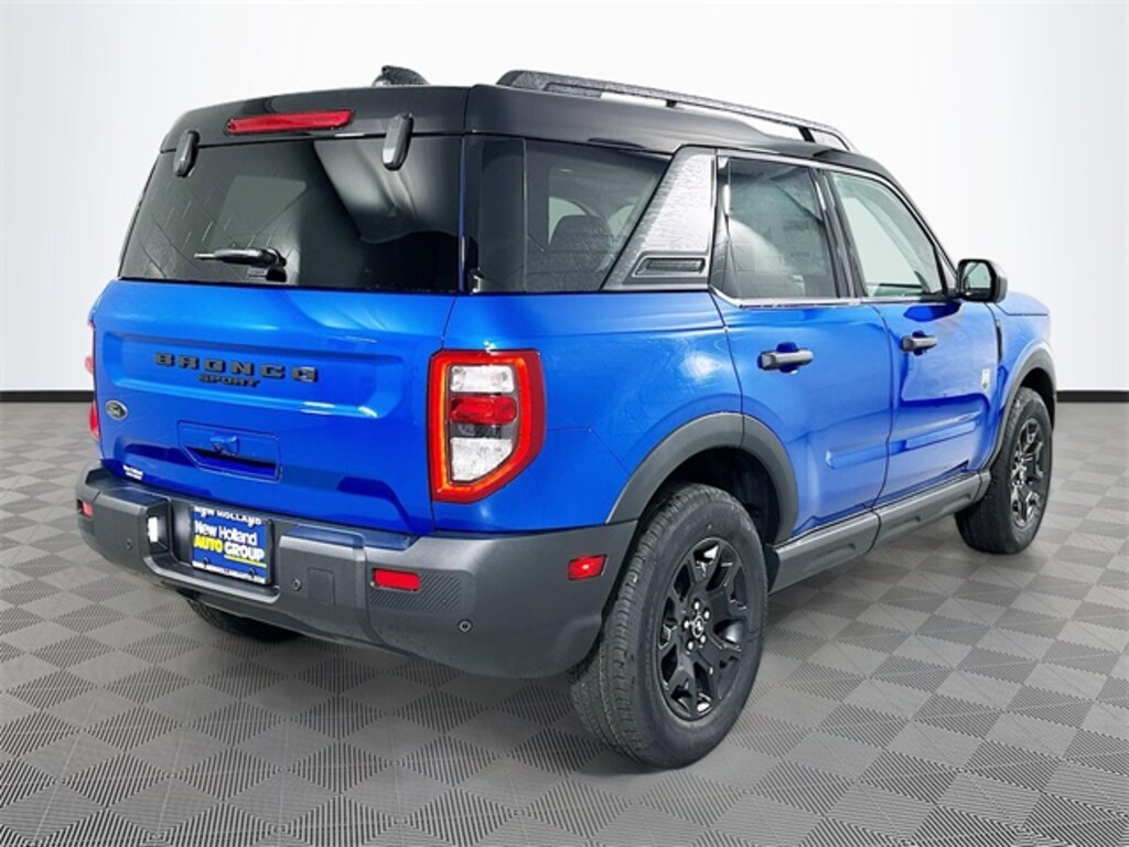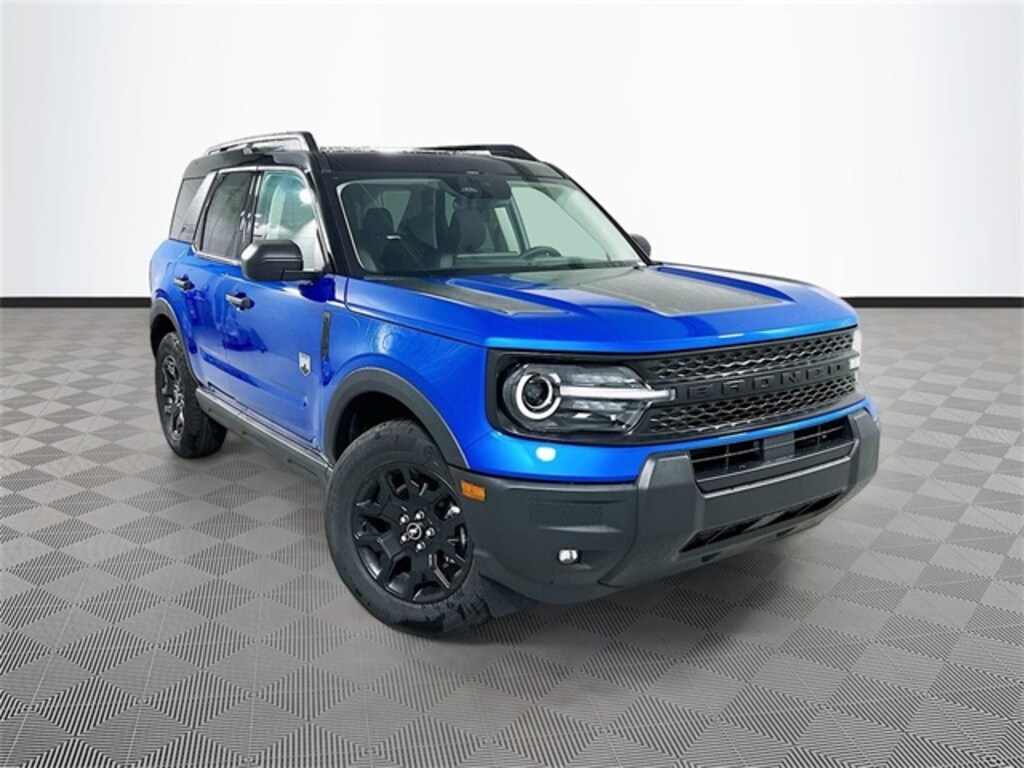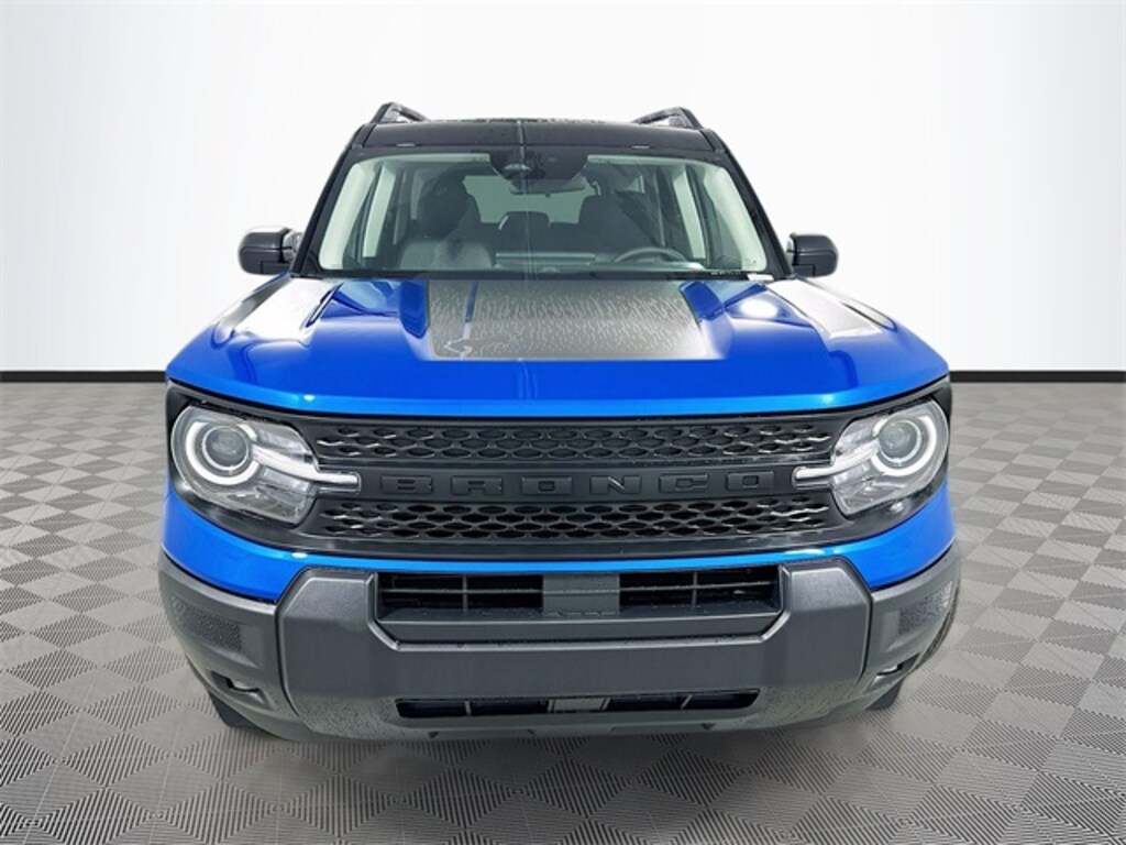 Blue 2025 Ford Bronco Sport Big Bend 4WD 1.5L EcoBoost 4D Sport Utility 8-Speed Automatic 4-Wheel Disc Brakes, 6 Speakers, ABS brakes, Air Conditioning, Alloy wheels, AM/FM radio: SiriusXM, AM/FM Stereo, Auto High-beam Headlights, Automatic temperature control, Black Appearance Package, Brake assist, Carbon Black Grille w/Black BRONCO Lettering, Cargo Mat, Cloth w/Easy-to-Clean Front Bucket Seats, Compass, Convenience Package, Delay-off headlights, Driver door bin, Driver vanity mirror, Dual front impact airbags, Dual front side impact airbags, Electronic Stability Control, Emergency communication system: SYNC 4 911 Assist, Equipment Group 200A, Four wheel independent suspension, Front & Rear Floor Liners w/o Carpet Mats, Front anti-roll bar, Front Bucket Seats, Front Center Armrest, Front Driver/Passenger Seat Back Map Pockets, Front reading lights, Fully automatic headlights, Heated 8-Way Power Driver's Seat, Heated door mirrors, Illuminated entry, Keyless Entry Keypad (DIO), Knee airbag, LED Fog Lamps, Liftgate w/Black BRONCO SPORT Lettering, Low tire pressure warning, Occupant sensing airbag, Outside temperature display, Overhead airbag, Overhead console, Painted Shadow Black Roof, Panic alarm, Passenger door bin, Passenger vanity mirror, Power door mirrors, Power Moonroof, Power steering, Power windows, Premium Trimmed Htd Fr Sport Contour Bucket Seats, Premium Wrapped Steering Wheel, Radio data system, Rear anti-roll bar, Rear Parking Sensors, Rear reading lights, Rear seat center armrest, Rear window defroster, Rear window wiper, Remote keyless entry, Security system, SiriusXM, Speed control, Speed-sensing steering, Speed-Sensitive Wipers, Split folding rear seat, Steering wheel mounted audio controls, SYNC 4 w/Enhanced Voice Recognition, Tachometer, Telescoping steering wheel, Tilt steering wheel, Traction control, Trip computer, Universal Garage Door Opener (UGDO), Variably intermittent wipers, Wheels: 17" Carbonized Gray-Painted Aluminum, Wheels: 17" Matte Black-Painted Aluminum.