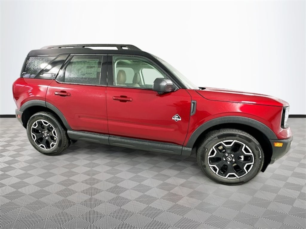 Ruby Red 2025 Ford Bronco Sport Outer Banks 4WD 1.5L EcoBoost 4D Sport Utility 8-Speed Automatic 360-Degree Camera w/Trail & Split View, 4-Wheel Disc Brakes, 6 Speakers, ABS brakes, Air Conditioning, Alloy wheels, AM/FM radio: SiriusXM, AM/FM Stereo, Auto High-beam Headlights, Auto-dimming Rear-View mirror, Automatic temperature control, B&O Sound System by Bang & Olufsen, Brake assist, Cargo Mat, Compass, Connected Navigation, Delay-off headlights, Driver door bin, Driver vanity mirror, Dual front impact airbags, Dual front side impact airbags, Electronic Stability Control, Emergency communication system: SYNC 4 911 Assist, Equipment Group 300A, Four wheel independent suspension, Front & Rear Floor Liners w/o Carpet Mats, Front anti-roll bar, Front Bucket Seats, Front Center Armrest, Front Driver/Passenger Seat Back Map Pockets, Front dual zone A/C, Front fog lights, Front License Plate Bracket, Front Parking Sensors, Front reading lights, Fully automatic headlights, Garage door transmitter, HD Radio, Heated door mirrors, Heated front seats, Heated steering wheel, Illuminated entry, Keyless Entry Keypad (DIO), Knee airbag, Low tire pressure warning, Memory seat, Occupant sensing airbag, Outer Banks Tech Package+, Outside temperature display, Overhead airbag, Overhead console, Panic alarm, Passenger door bin, Passenger vanity mirror, Power door mirrors, Power driver seat, Power Moonroof, Power passenger seat, Power steering, Power windows, Premium Trimmed Front Bucket Seats w/Ebony/Roast, Radio data system, Rain sensing wipers, Rear anti-roll bar, Rear Parking Sensors, Rear reading lights, Rear seat center armrest, Rear window defroster, Rear window wiper, Remote keyless entry, Reverse Brake Assist, Security system, SiriusXM, Speed control, Speed-sensing steering, Speed-Sensitive Wipers, Split folding rear seat, Steering wheel mounted audio controls, SYNC 4 w/Enhanced Voice Recognition, Tachometer, Telescoping steering wheel, Tilt steering wheel, Traction control, Trip computer, Variably intermittent wipers, Wheels: 18" Ebony Black-Painted Aluminum.