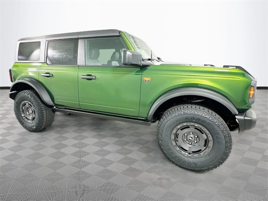 Green 2025 Ford Bronco Badlands 4WD 2.7L EcoBoost V6 4D Sport Utility 10-Speed Automatic 2-Door Intelligent Access w/Lock/Unlock, 4-Wheel Disc Brakes, 7 Speakers, ABS brakes, Air Conditioning, Alloy wheels, AM/FM radio: SiriusXM with 360L, AM/FM Stereo, Ambient Footwell Lighting, Auto High-Beam Headlamps, Auto High-beam Headlights, Auto-dimming Rear-View mirror, BLIS Blind Spot Information System, Brake assist, Carbonized Gray Molded-In-Color Hard Top, Compass, Connected Navigation, Delay-off headlights, Dr & Pass Illuminated Sliding Visor Vanity Mirrors, Driver door bin, Driver vanity mirror, Dual front impact airbags, Dual front side impact airbags, Dual Smart Charging USB Ports, Dual-Zone Electronic Automatic Temperature Control, Electronic Stability Control, Emergency communication system: 911 Assist, Engine Block Heater, Equipment Group 332A Mid Package, Exterior Parking Camera Rear, Front anti-roll bar, Front Bucket Seats, Front Center Armrest, Front fog lights, Front reading lights, Front Row Heated Seats, Front wheel independent suspension, Fully automatic headlights, Heated door mirrors, Heated front seats, Heated steering wheel, High Clearance Fender Flares, High Clearance Suspension, Illuminated entry, Integrated roll-over protection, Lane-Keeping System, Leather Shift Knob, Low tire pressure warning, Marine Grade Vinyl Heated Bucket Seats, Occupant sensing airbag, Outside temperature display, Overhead airbag, Overhead console, Panic alarm, Passenger door bin, Passenger vanity mirror, Position-Sensitive Bilstein Shock Absorbers, Power door mirrors, Power Outlet - Back Side of Center Floor Console, Power steering, Power windows, Pre-Collision Assist w/Automatic Emergency Braking, Radio data system, Rear Parking Sensors, Rear-View Camera, Rear-Window Defroster & Washer, Remote keyless entry, Sasquatch Package, Security system, SiriusXM w/360L, Speed control, Split folding rear seat, Steering wheel mounted audio controls, SYNC 4, Tachometer, Telescoping steering wheel, Tilt steering wheel, Traction control, Trip computer, Variably intermittent wipers, Voltmeter, Wheels: 17" Carbonized Gray Painted Aluminum, Wheels: 17" Carbonized Gray-Painted Aluminum.