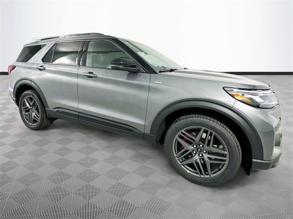 Gray 2025 Ford Explorer ST-Line 4WD 2.3L EcoBoost I-4 4D Sport Utility 10-Speed Automatic 4WD, 10 Speakers, 3.58 Non-Limited Slip Rear Axle, 3rd row seats: bench, 4-Wheel Disc Brakes, ABS brakes, Air Conditioning, Alloy wheels, AM/FM radio: SiriusXM with 360L, Apple CarPlay/Android Auto, Auto High-beam Headlights, Automatic temperature control, Brake assist, Bumpers: body-color, Compass, Delay-off headlights, Driver door bin, Driver vanity mirror, Dual front impact airbags, Dual front side impact airbags, Electronic Stability Control, Emergency communication system: 911 Assist, Equipment Group 300A Standard Package, Exterior Parking Camera Rear, Four wheel independent suspension, Front anti-roll bar, Front Bucket Seats, Front Center Armrest, Front dual zone A/C, Front fog lights, Front reading lights, Fully automatic headlights, Garage door transmitter, Heated door mirrors, Heated front seats, Heated steering wheel, Heated Unique Cloth Captain's Chairs, Illuminated entry, Knee airbag, Leather steering wheel, Low tire pressure warning, Navigation System, Occupant sensing airbag, Outside temperature display, Overhead airbag, Overhead console, Panic alarm, Passenger door bin, Passenger vanity mirror, Performance Brakes, Power door mirrors, Power driver seat, Power Liftgate, Power passenger seat, Power steering, Power windows, Radio: B&O Sound System by Bang & Olufsen, Rear air conditioning, Rear anti-roll bar, Rear reading lights, Rear window defroster, Rear window wiper, Red Painted Perf Front & Rear Brake Calipers, Remote keyless entry, Security system, Speed control, Speed-sensing steering, Speed-Sensitive Wipers, Split folding rear seat, Spoiler, ST-Line Street Pack, Steering wheel mounted audio controls, Tachometer, Telescoping steering wheel, Tilt steering wheel, Traction control, Trip computer, Variably intermittent wipers, Wheels: 20" Ebony-Painted Machined Aluminum, Wheels: 21" Magnetite-Painted Aluminum, 4WD.