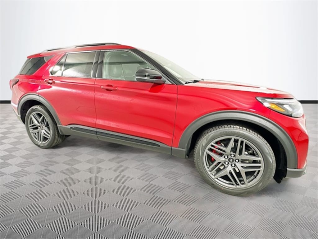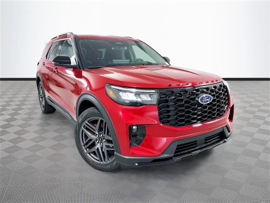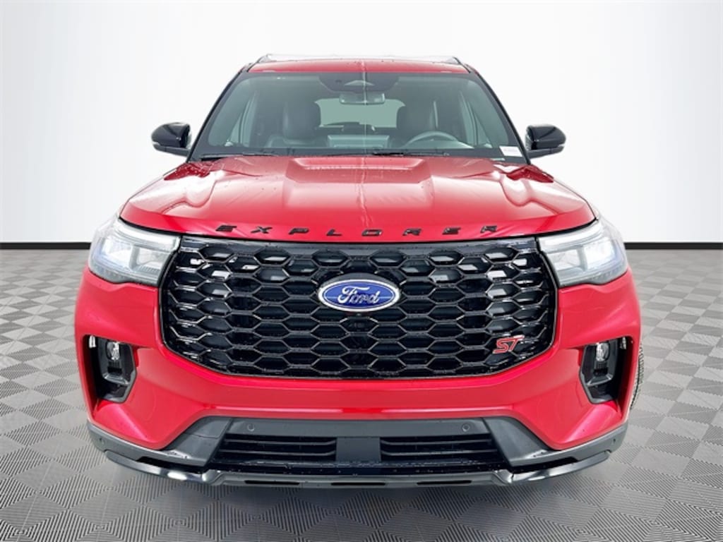 Red Metallic 2025 Ford Explorer ST 4WD 3.0L EcoBoost V6 4D Sport Utility 10-Speed Automatic 4WD, 10 Speakers, 3.58 Non-Limited Slip Rear Axle, 3rd row seats: bench, 3rd Rw All-Wthr Flr Liners w/2nd Rw Cap Chairs, 4-Wheel Disc Brakes, ABS brakes, Air Conditioning, Alloy wheels, AM/FM radio: SiriusXM with 360L, Apple CarPlay/Android Auto, Auto High-beam Headlights, Auto-dimming door mirrors, Auto-dimming Rear-View mirror, Automatic temperature control, B&O Sound System by Bang & Olufsen, Brake assist, Bumpers: body-color, Compass, Delay-off headlights, Driver door bin, Driver vanity mirror, Dual front impact airbags, Dual front side impact airbags, Electronic Stability Control, Emergency communication system: 911 Assist, Equipment Group 400A Standard Package, Exterior Parking Camera Rear, Ford BlueCruise Equipped (1-Year Plan), Four wheel independent suspension, Front anti-roll bar, Front Bucket Seats, Front Center Armrest, Front dual zone A/C, Front fog lights, Front reading lights, Fully automatic headlights, Garage door transmitter, Heated door mirrors, Heated front seats, Heated rear seats, Heated steering wheel, Heated/Ventilated Miko Sport Captain's Chairs, Illuminated entry, Knee airbag, Leather steering wheel, Low tire pressure warning, Memory seat, Multicontour Seats w/Front Active Motion, Navigation System, Occupant sensing airbag, Outside temperature display, Overhead airbag, Overhead console, Panic alarm, Panoramic Vista Roof w/Power Shade, Passenger door bin, Passenger vanity mirror, Power door mirrors, Power driver seat, Power Liftgate, Power passenger seat, Power steering, Power windows, Radio: B&O Sound System by Bang & Olufsen, Rain sensing wipers, Rear air conditioning, Rear anti-roll bar, Rear reading lights, Rear window defroster, Rear window wiper, Remote keyless entry, SecuriCode Keyless Entry Keypad, Security system, Speed control, Speed-sensing steering, Speed-Sensitive Wipers, Split folding rear seat, Spoiler, Sport steering wheel, Steering wheel mounted audio controls, Sun and Sound Package, Tachometer, Telescoping steering wheel, Tilt steering wheel, Traction control, Trip computer, Turn signal indicator mirrors, Variably intermittent wipers, Ventilated front seats, Wheels: 21" Magnetite-Painted Aluminum, 4WD.