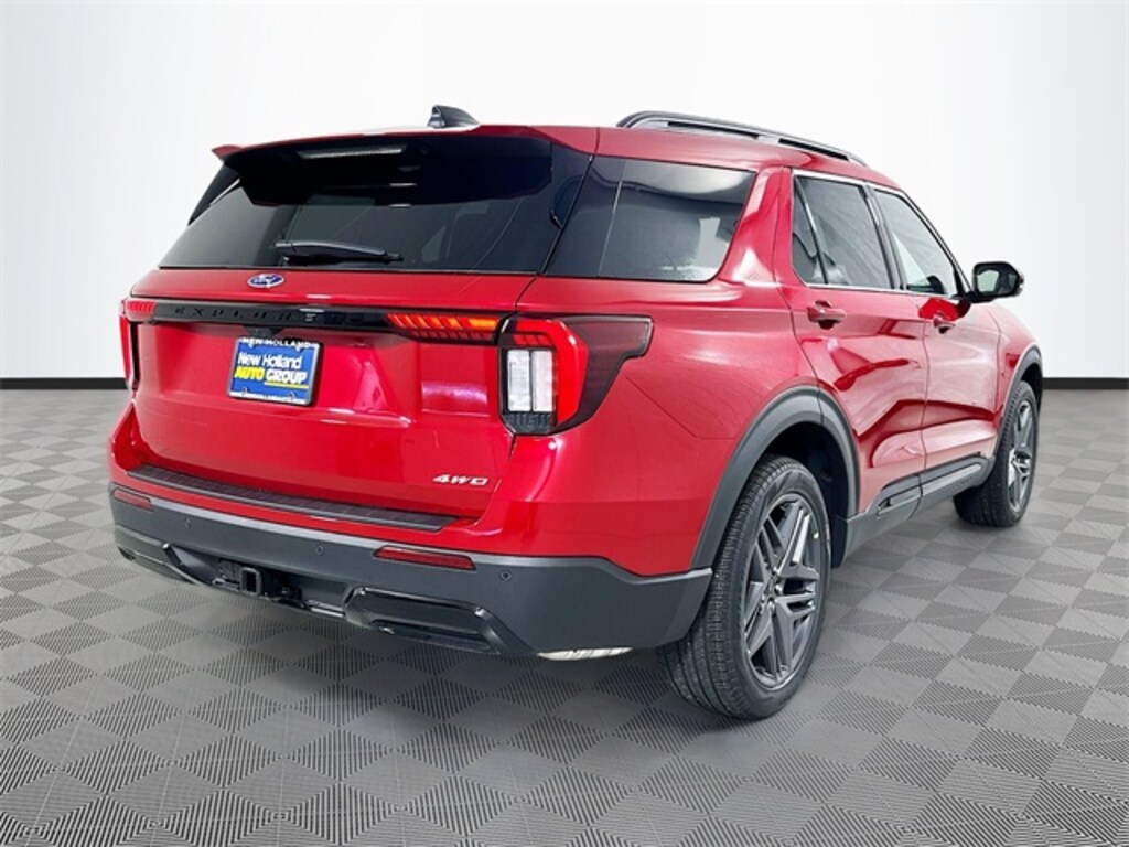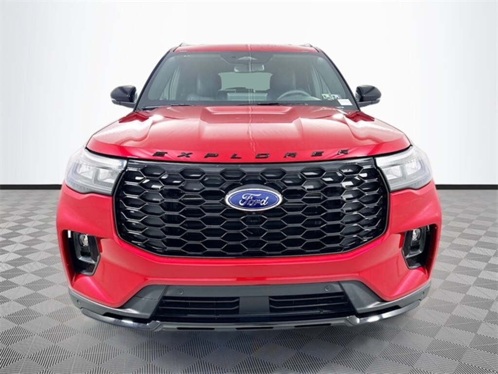 Red Metallic 2025 Ford Explorer ST-Line 4WD 2.3L EcoBoost I-4 4D Sport Utility 10-Speed Automatic 4WD, 10 Speakers, 110V/150W AC Power Outlet, 2nd Row Captain's Chairs w/E-Z Entry & Armrest, 2nd Row Heated Seats, 3.58 Non-Limited Slip Rear Axle, 3rd row seats: bench, 4-Wheel Disc Brakes, ABS brakes, Air Conditioning, Alloy wheels, AM/FM radio: SiriusXM with 360L, Ambient Lighting, Apple CarPlay/Android Auto, Auto High-beam Headlights, Auto-Dimming Interior Rear-View Mirror, Automatic temperature control, Brake assist, Bumpers: body-color, Compass, Delay-off headlights, Driver door bin, Driver vanity mirror, Dual front impact airbags, Dual front side impact airbags, Electronic Stability Control, Emergency communication system: 911 Assist, Equipment Group 300A Standard Package, Exterior Parking Camera Rear, Four wheel independent suspension, Front anti-roll bar, Front Bucket Seats, Front Center Armrest, Front dual zone A/C, Front fog lights, Front reading lights, Fully automatic headlights, Garage door transmitter, Heated door mirrors, Heated front seats, Heated steering wheel, Heated Unique Cloth Captain's Chairs, Illuminated entry, Knee airbag, Leather steering wheel, Low tire pressure warning, Memory Driver's Seat, Navigation System, Occupant sensing airbag, Outside temperature display, Overhead airbag, Overhead console, Panic alarm, Panoramic Vista Roof w/Power Shade, Passenger door bin, Passenger vanity mirror, Performance Brakes, Power door mirrors, Power driver seat, Power Liftgate, Power passenger seat, Power steering, Power windows, Power-Folding Sideview Mirrors w/Autofold, Premium Package, Radio: B&O Sound System by Bang & Olufsen, Rain-Sensing Wipers (Front Only), Rear air conditioning, Rear anti-roll bar, Rear reading lights, Rear window defroster, Rear window wiper, Red Painted Perf Front & Rear Brake Calipers, Remote keyless entry, Security system, Speed control, Speed-sensing steering, Speed-Sensitive Wipers, Split folding rear seat, Spoiler, ST-Line Street Pack, Steering wheel mounted audio controls, Tachometer, Telescoping steering wheel, Tilt steering wheel, Traction control, Trip computer, Variably intermittent wipers, Wheels: 20" Ebony-Painted Machined Aluminum, Wheels: 21" Magnetite-Painted Aluminum, Wireless Charging Pad, 4WD.