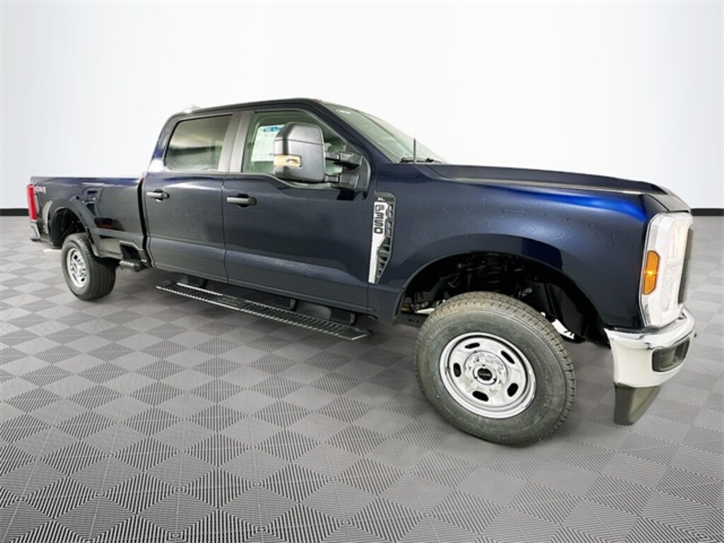 Blue Metallic 2025 Ford F-350SD XL 4WD 6.8L V8 4D Crew Cab 10-Speed Automatic 4WD, 17" Argent Painted Steel Wheels, 250 Amp Alternator (Gas), 4-Wheel Disc Brakes, 6 Speakers, ABS brakes, Air Conditioning, AM/FM radio, AM/FM Stereo w/MP3 Player, Brake assist, Bright Chrome Hub Covers & Center Ornaments, Chrome Front Bumper, Chrome Rear Step Bumper, Compass, Delay-off headlights, Dual front impact airbags, Dual front side impact airbags, Electronic Stability Control, Emergency communication system: SYNC 4 911 Assist, Exterior Parking Camera Rear, Front anti-roll bar, Front Center Armrest w/Storage, Front License Plate Bracket, Front reading lights, Fully automatic headlights, Halogen Fog Lamps, HD Vinyl 40/20/40 Split Bench Seat, Heated door mirrors, Illuminated entry, LED Roof Clearance Lights, Low tire pressure warning, Order Code 610A, Outside temperature display, Overhead airbag, Overhead console, Panic alarm, Passenger vanity mirror, Platform Running Boards, Power door mirrors, Power steering, Power windows, Power-Sliding Rear-Window w/Defrost, Privacy Glass, Rear reading lights, Rear step bumper, Remote keyless entry, Security system, Snow Plow Prep Package, Speed control, Split folding rear seat, Steering wheel mounted audio controls, SYNC 4, Tachometer, Telescoping steering wheel, Tilt steering wheel, Traction control, Trailer Brake Controller, Trip computer, Turn signal indicator mirrors, Upfitter Switches (6), Variably intermittent wipers, XL Chrome Package, 4WD.