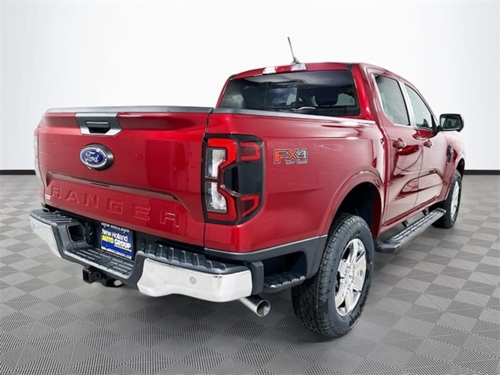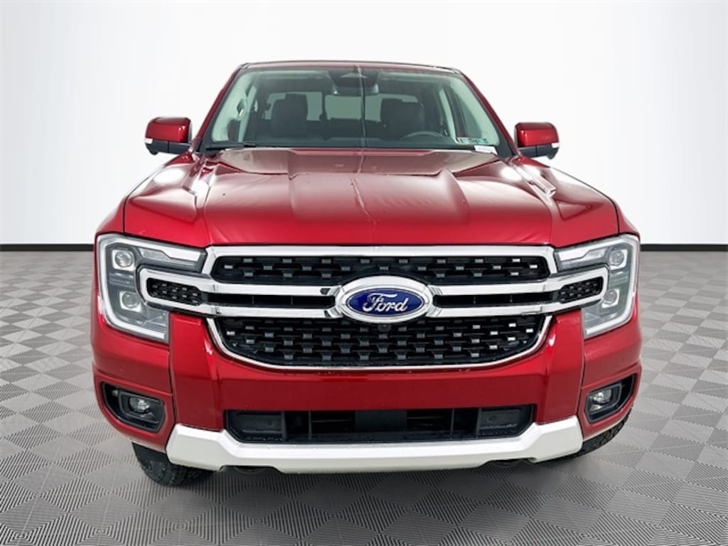Ruby Red Metallic 2025 Ford Ranger Lariat 4WD EcoBoost 2.3L I4 GTDi DOHC Turbocharged VCT 4D Crew Cab 10-Speed Automatic 4WD, 10 Speakers, 120V/400W In-Cab & In-Bed Power Outlets, 4-Wheel Disc Brakes, ABS brakes, Air Conditioning, Alloy wheels, AM/FM radio: SiriusXM, Auto High-beam Headlights, Auto-dimming Rear-View mirror, Automatic temperature control, Black Running Boards, Body Color Painted Front Fascia, Brake assist, Chrome Accent Package, Chrome Center Bar & Grille Surround, Chrome Rear Bumper, Class IV Trailer Hitch Receiver, Compass, Convenience Package, Delay-off headlights, Driver door bin, Driver vanity mirror, Dual front impact airbags, Dual front side impact airbags, Electronic Stability Control, Emergency communication system: SYNC 4 911 Assist, Equipment Group 500A Standard, Front anti-roll bar, Front Bucket Seats, Front Center Armrest, Front dual zone A/C, Front fog lights, Front reading lights, Front wheel independent suspension, Fully automatic headlights, FX4 Off-Road Box Decal, FX4 Off-Road Package, FX4 Selectable Drive Modes, Garage door transmitter, Gray Painted Center Bar & Grille Surround, Gray Painted Front Fascia & Rear Bumper, Heated door mirrors, Heated front seats, Heated steering wheel, Illuminated entry, Integrated Box Side Step, Internet access capable: FordPass Connect 4G, Leather Shift Knob, Leather steering wheel, Leather-Trimmed Front Heated Bucket Seats, Low tire pressure warning, Memory seat, Navigation system: Connected Navigation, Occupant sensing airbag, Off-Road Screen in Center Stack, Off-Road Tuned Shocks, Outside temperature display, Overhead airbag, Overhead console, Painted Body-Color Wheel Lip Molding, Panic alarm, Passenger door bin, Passenger vanity mirror, Power door mirrors, Power driver seat, Power passenger seat, Power steering, Power windows, Radio: B&O Sound System by Bang & Olufsen, Rain sensing wipers, Rear reading lights, Rear seat center armrest, Rear step bumper, Rear window defroster, Remote keyless entry, Security system, SiriusXM Satellite Radio, Speed control, Speed-sensing steering, Sport Appearance Package, Sport Box Decal, Steering wheel mounted audio controls, SYNC 4A w/Connected Navigation, Telescoping steering wheel, Tilt steering wheel, Traction control, Trail Control, Trailer Tow Package, Tray Style Floor Liner, Trip computer, Turn signal indicator mirrors, Variably intermittent wipers, Voltmeter, Wheels: 18" Chrome-Like PVD, Wheels: 18" Machined Aluminum w/Dark Pockets, Wireless Charging Pad, 4WD.