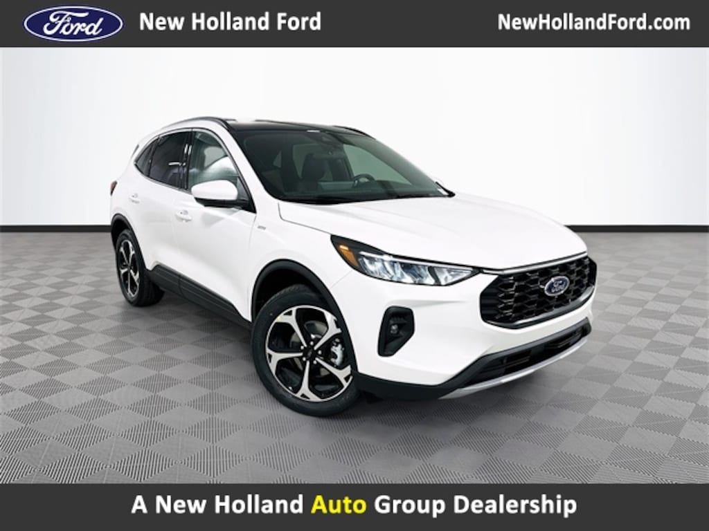 White 2026 Ford Escape Hybrid ST-Line Select AWD 2.5L iVCT 4D Sport Utility eCVT 2.5L iVCT, 10-Way Power Driver's Seat, 10-Way Power Driver's Seat w/Memory, 12.3" Digital Productivity Screen in Instrument Panel Cluster, 2.91 Axle Ratio, 360-Degree Camera with Split View, 4-Way Manual Front Passenger Seat, 4-Wheel Disc Brakes, 6 Speakers, 6-Way Power Front Passenger Seat, 8-Way Power Driver Seat, ABS brakes, Adaptive Cruise Control with Stop-and-Go, Air Conditioning, Alloy wheels, AM/FM radio: SiriusXM 360L, Auto High-beam Headlights, Automatic temperature control, B&O Sound System by Bang & Olufsen, Black Roof-Rack Side Rails, Body Color Mirrors, Brake assist, Bumpers: body-color, Cargo Mat, Compass, Connected Navigation (1-Year Included), Delay-off headlights, Driver door bin, Driver vanity mirror, Dual front impact airbags, Dual front side impact airbags, Electronic Fuel Door Release, Electronic Stability Control, Emergency communication system: SYNC 4 911 Assist, Equipment Group 400A, Evasive Steering Assist, Ford App, Ford Co-Pilot360 Assist 2.0, Four wheel independent suspension, Front and Rear Floor Liners with Carpet Mats, Front anti-roll bar, Front Bucket Seats, Front Center Armrest, Front dual zone A/C, Front fog lights, Front reading lights, Fully automatic headlights, HD Radio, Heated door mirrors, Heated front seats, Heated steering wheel, Illuminated entry, Intersection Assist, Knee airbag, Low tire pressure warning, Memory Package, Memory seat, Neutral Towing Capability, Occupant sensing airbag, Outside temperature display, Overhead airbag, Overhead console, Panic alarm, Panoramic Vista Roof, Partial Vinyl/Cloth Heated Front Sport Contour Bucket Seats with Red Stitching, Passenger door bin, Passenger vanity mirror, Pedestrian Alert Sounder, Power door mirrors, Power driver seat, Power Liftgate, Power steering, Power windows, Predictive Speed Assist, Radio data system, Radio: AM/FM Stereo with SiriusXM 360L, Rear anti-roll bar, Rear Parking Sensor, Rear reading lights, Rear seat center armrest, Rear window defroster, Rear window wiper, Remote keyless entry, Reverse Brake Assist, SecuriCode Illuminated Door Entry Keypad, Speed control, Speed-sensing steering, Speed-Sensitive Wipers, Split folding rear seat, Spoiler, Sport steering wheel, Steering wheel mounted audio controls, SYNC 4, SYNC 4 with Enhanced Voice Recognition, Tachometer, Tech Pack #2, Telescoping steering wheel, Tilt steering wheel, Traction control, Trip computer, Variably intermittent wipers, Wheels: 18" Rock Metallic Painted Aluminum, Wheels: 19" Machined-Face Ebony-Painted Aluminum, Wireless Charging Pad, 2.5L iVCT.