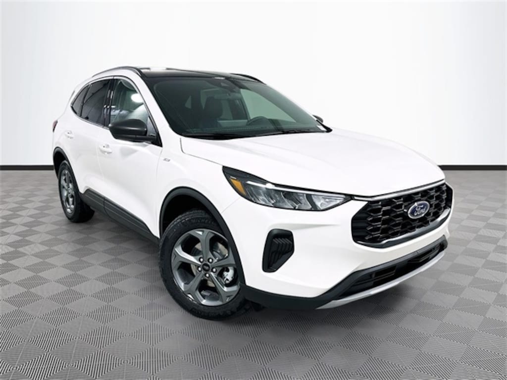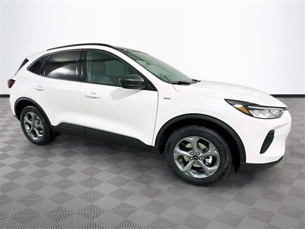 White 2026 Ford Escape ST-Line AWD 1.5L EcoBoost 4D Sport Utility Automatic AWD, 3.81 Axle Ratio, 4-Way Manual Front Passenger Seat, 4-Wheel Disc Brakes, 6 Speakers, 8-Way Power Driver Seat, ABS brakes, Air Conditioning, Alloy wheels, AM/FM radio: SiriusXM 360L, Auto High-beam Headlights, Automatic temperature control, Brake assist, Bumpers: body-color, Compass, Delay-off headlights, Driver door bin, Driver vanity mirror, Dual front impact airbags, Dual front side impact airbags, Electronic Stability Control, Emergency communication system: SYNC 4 911 Assist, Ford App, Four wheel independent suspension, Front anti-roll bar, Front Bucket Seats, Front Center Armrest, Front dual zone A/C, Front reading lights, Fully automatic headlights, Heated steering wheel, Illuminated entry, Knee airbag, Low tire pressure warning, Occupant sensing airbag, Outside temperature display, Overhead airbag, Overhead console, Panic alarm, Partial Vinyl/Cloth Front Sport Contour Bucket Seats with Red Stitching, Passenger door bin, Passenger vanity mirror, Power door mirrors, Power driver seat, Power steering, Power windows, Radio data system, Radio: AM/FM Stereo with SiriusXM 360L, Rear anti-roll bar, Rear reading lights, Rear seat center armrest, Rear window defroster, Rear window wiper, Remote keyless entry, Speed control, Speed-sensing steering, Speed-Sensitive Wipers, Split folding rear seat, Spoiler, Sport steering wheel, Steering wheel mounted audio controls, SYNC 4, Tachometer, Telescoping steering wheel, Tilt steering wheel, Traction control, Trip computer, Variably intermittent wipers, Wheels: 18" Rock Metallic Painted Aluminum, AWD.