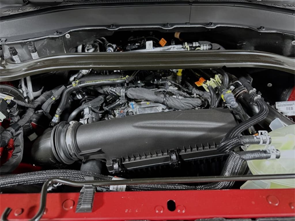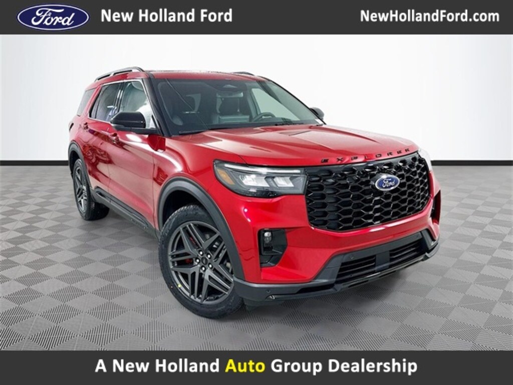 Red Metallic 2026 Ford Explorer ST-Line 4WD 2.3L EcoBoost I-4 4D Sport Utility 10-Speed Automatic 4WD, 10 Speakers, 3rd row seats: bench, 4-Wheel Disc Brakes, ABS brakes, Air Conditioning, Alloy wheels, AM/FM radio: SiriusXM with 360L, Apple CarPlay/Android Auto, Auto High-beam Headlights, Automatic temperature control, Brake assist, Bumpers: body-color, Compass, Delay-off headlights, Driver door bin, Driver vanity mirror, Dual front impact airbags, Dual front side impact airbags, Electronic Stability Control, Emergency communication system: 911 Assist, Exterior Parking Camera Rear, Four wheel independent suspension, Front anti-roll bar, Front Bucket Seats, Front Center Armrest, Front dual zone A/C, Front fog lights, Front reading lights, Fully automatic headlights, Garage door transmitter, Heated door mirrors, Heated front seats, Heated steering wheel, Heated Unique Cloth Captain's Chairs, Illuminated entry, Knee airbag, Leather steering wheel, Low tire pressure warning, Navigation System, Occupant sensing airbag, Outside temperature display, Overhead airbag, Overhead console, Panic alarm, Passenger door bin, Passenger vanity mirror, Power door mirrors, Power driver seat, Power Liftgate, Power passenger seat, Power steering, Power windows, Radio: B&O Sound System by Bang and Olufsen, Rear air conditioning, Rear anti-roll bar, Rear reading lights, Rear window defroster, Rear window wiper, Remote keyless entry, Security system, Speed control, Speed-sensing steering, Speed-Sensitive Wipers, Split folding rear seat, Spoiler, Steering wheel mounted audio controls, Tachometer, Telescoping steering wheel, Tilt steering wheel, Traction control, Trip computer, Variably intermittent wipers, Wheels: 20" Ebony-Painted Machined Aluminum, 4WD.