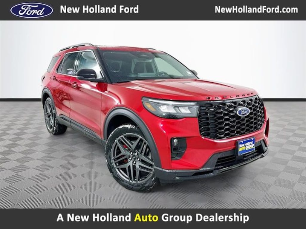 Rapid Red Metallic Tinted Clearcoat 2026 Ford Explorer ST-Line 4WD 2.3L EcoBoost I-4 4D Sport Utility 10-Speed Automatic 4WD, 110V/150W AC Power Outlet, 2nd Row Heated Seats, Ambient Lighting, Auto-Dimming Interior Rear-View Mirror, Equipment Group 300A Standard Package, Ford Connectivity Package (one-Time Purchase - 7 Years), Heated Unique Cloth Captain's Chairs, Manual-Folding Sideview Mirrors, Memory Driver's Seat, Performance Brakes, Premium Package, Radio: B&O Sound System by Bang and Olufsen, Rain-Sensing Wipers (front Only), Red Painted Performance Front and Rear Brake Calipers, ST-Line Street Pack, Wheels: 20" Ebony-Painted Machined Aluminum, Wheels: 21" Magnetite-Painted Aluminum, 10 Speakers, 2nd Row Captain's Chairs w/E-Z Entry and Armrest, 3rd row seats: bench, 4-Wheel Disc Brakes, ABS brakes, Air Conditioning, Alloy wheels, AM/FM radio: SiriusXM with 360L, Apple CarPlay/Android Auto, Auto High-beam Headlights, Automatic temperature control, BlueCruise (equipment + 1-Year + 90-Day Plan), BlueCruise Hardware, Brake assist, Bumpers: body-color, Compass, Delay-off headlights, Driver door bin, Driver vanity mirror, Dual front impact airbags, Dual front side impact airbags, Electronic Stability Control, Emergency communication system: 911 Assist, Exterior Parking Camera Rear, First Aid Kit, Four wheel independent suspension, Front and 2nd Rows Floor Liners with Carper Floor Mats, Front anti-roll bar, Front Bucket Seats, Front Center Armrest, Front dual zone A/C, Front fog lights, Front License Plate Bracket, Front reading lights, Fully automatic headlights, Garage door transmitter, Heated door mirrors, Heated front seats, Heated steering wheel, Illuminated entry, Knee airbag, Leather steering wheel, Low tire pressure warning, Navigation System, Occupant sensing airbag, Outside temperature display, Overhead airbag, Overhead console, Panic alarm, Panoramic Fixed Glass Roof with Power Shade, Passenger door bin, Passenger vanity mirror, Power door mirrors, Power driver seat, Power Liftgate, Power passenger seat, Power steering, Power windows, Rear air conditioning, Rear anti-roll bar, Rear reading lights, Rear window defroster, Rear window wiper, Remote keyless entry, SecuriCode Keyless Entry Keypad, Security system, SiriusXM with 360L (3-Year Plan), Speed control, Speed-sensing steering, Speed-Sensitive Wipers, Split folding rear seat, Spoiler, Steering wheel mounted audio controls, Tachometer, Telescoping steering wheel, Tilt steering wheel, Traction control, Trip computer, Variably intermittent wipers, Wheel Lock Kit, 4WD, 110V/150W AC Power Outlet, 2nd Row Heated Seats, Ambient Lighting, Auto-Dimming Interior Rear-View Mirror, Equipment Group 300A Standard Package, Ford Connectivity Package (one-Time Purchase - 7 Years), Heated Unique Cloth Captain's Chairs, Manual-Folding Sideview Mirrors, Memory Driver's Seat, Performance Brakes, Premium Package, Radio: B&O Sound System by Bang and Olufsen, Rain-Sensing Wipers (front Only), Red Painted Performance Front and Rear Brake Calipers, ST-Line Street Pack, Wheels: 20" Ebony-Painted Machined Aluminum, Wheels: 21" Magnetite-Painted Aluminum.