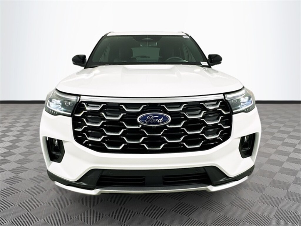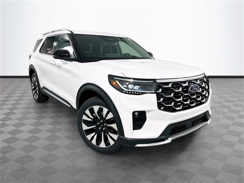 White Metallic 2026 Ford Explorer Platinum 4WD 2.3L EcoBoost I-4 4D Sport Utility Automatic 4WD, 14 Speakers, 3rd row seats: bench, 4-Wheel Disc Brakes, ABS brakes, ActiveX Trimmed Captain's Chairs, Air Conditioning, Alloy wheels, AM/FM radio: SiriusXM with 360L, Apple CarPlay/Android Auto, Auto High-beam Headlights, Auto-dimming door mirrors, Auto-dimming Rear-View mirror, Automatic temperature control, Brake assist, Bumpers: body-color, Compass, Delay-off headlights, Driver door bin, Driver vanity mirror, Dual front impact airbags, Dual front side impact airbags, Electronic Stability Control, Emergency communication system: 911 Assist, Equipment Group 600A Standard Package, Exterior Parking Camera Rear, Four wheel independent suspension, Front & 2nd Rows Floor Liners w/Carpet Floor Mats, Front anti-roll bar, Front Bucket Seats, Front Center Armrest, Front dual zone A/C, Front fog lights, Front reading lights, Fully automatic headlights, Garage door transmitter, Heated door mirrors, Heated front seats, Heated rear seats, Heated steering wheel, Illuminated entry, Knee airbag, Leather steering wheel, Low tire pressure warning, Lux Leather Package, Memory seat, Navigation System, Occupant sensing airbag, Outside temperature display, Overhead airbag, Overhead console, Panic alarm, Panoramic Fixed Glass Roof w/Power Shade, Passenger door bin, Passenger vanity mirror, Platinum Badges on Front Row Seats, Power door mirrors, Power driver seat, Power Liftgate, Power passenger seat, Power steering, Power windows, Premium Leather Seating Surfaces Captain's Chairs, Quilting & Stitching on Door Panels, Quilting & Stitching on Seats, Radio data system, Radio: B&O Sound System by Bang & Olufsen w/HD, Rain sensing wipers, Rear air conditioning, Rear anti-roll bar, Rear reading lights, Rear window defroster, Rear window wiper, Remote keyless entry, SecuriCode Keyless Entry Keypad, Security system, SiriusXM w/360L (3-Year Plan), Speed control, Speed-sensing steering, Speed-Sensitive Wipers, Split folding rear seat, Spoiler, Steering wheel mounted audio controls, Tachometer, Telescoping steering wheel, Tilt steering wheel, Traction control, Trip computer, Turn signal indicator mirrors, Variably intermittent wipers, Ventilated front seats, Wheels: 20" Luster Nickel-Painted Aluminum, Wheels: 21" Bright Machined Alum w/Tarnish Dk Pkts, 4WD.