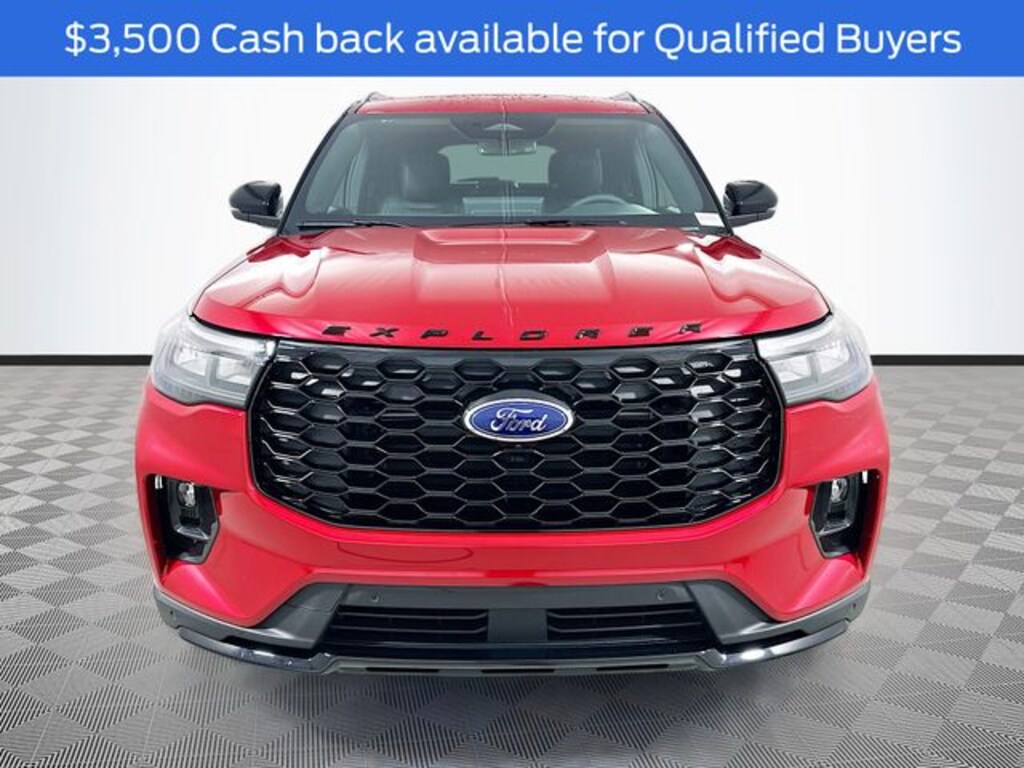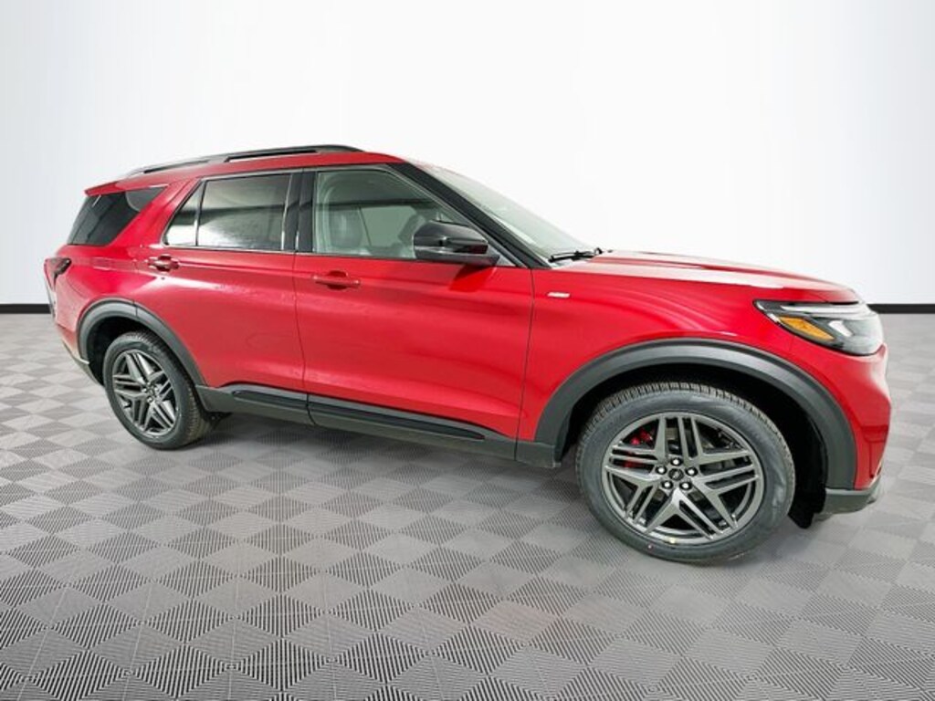 Red Metallic 2026 Ford Explorer ST-Line 4WD 2.3L EcoBoost I-4 4D Sport Utility 10-Speed Automatic 4WD, 10 Speakers, 3rd row seats: bench, 4-Wheel Disc Brakes, ABS brakes, Air Conditioning, Alloy wheels, AM/FM radio: SiriusXM with 360L, Apple CarPlay/Android Auto, Auto High-beam Headlights, Automatic temperature control, Brake assist, Bumpers: body-color, Compass, Delay-off headlights, Driver door bin, Driver vanity mirror, Dual front impact airbags, Dual front side impact airbags, Electronic Stability Control, Emergency communication system: 911 Assist, Exterior Parking Camera Rear, Four wheel independent suspension, Front anti-roll bar, Front Bucket Seats, Front Center Armrest, Front dual zone A/C, Front fog lights, Front reading lights, Fully automatic headlights, Garage door transmitter, Heated door mirrors, Heated front seats, Heated steering wheel, Heated Unique Cloth Captain's Chairs, Illuminated entry, Knee airbag, Leather steering wheel, Low tire pressure warning, Navigation System, Occupant sensing airbag, Outside temperature display, Overhead airbag, Overhead console, Panic alarm, Passenger door bin, Passenger vanity mirror, Power door mirrors, Power driver seat, Power Liftgate, Power passenger seat, Power steering, Power windows, Radio: B&O Sound System by Bang and Olufsen, Rear air conditioning, Rear anti-roll bar, Rear reading lights, Rear window defroster, Rear window wiper, Remote keyless entry, Security system, Speed control, Speed-sensing steering, Speed-Sensitive Wipers, Split folding rear seat, Spoiler, Steering wheel mounted audio controls, Tachometer, Telescoping steering wheel, Tilt steering wheel, Traction control, Trip computer, Variably intermittent wipers, Wheels: 20" Ebony-Painted Machined Aluminum, 4WD.