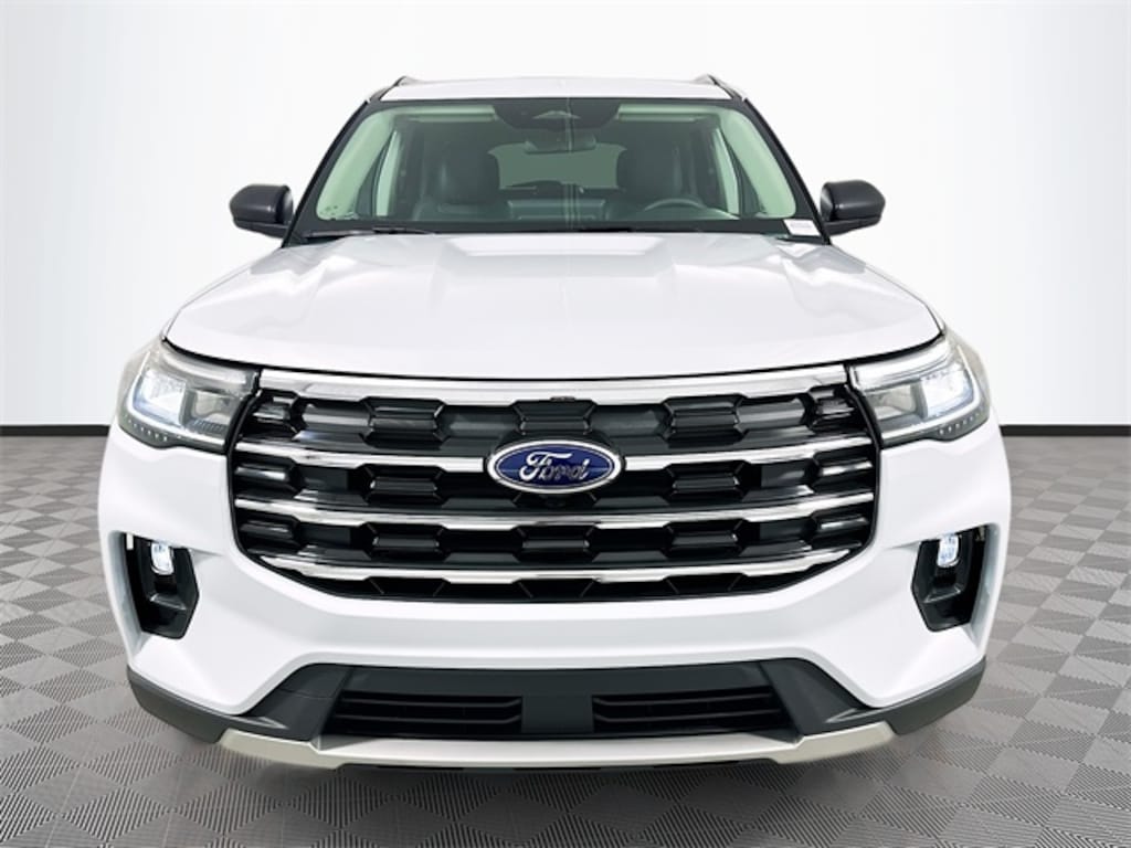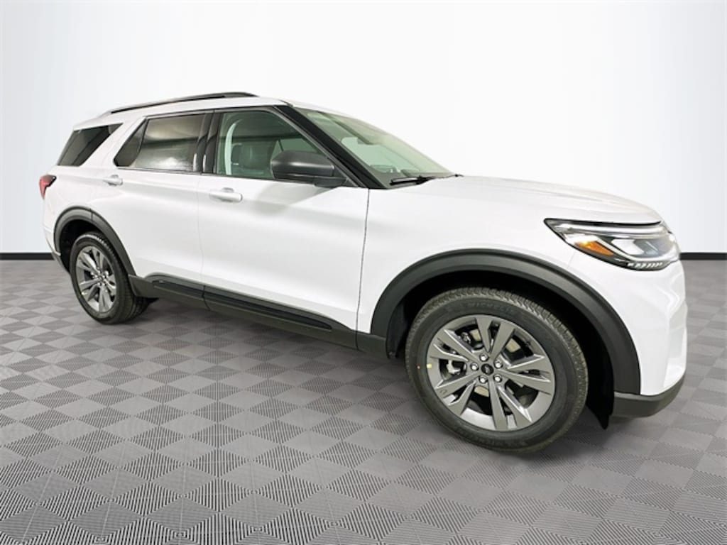White 2026 Ford Explorer Active 4WD 2.3L EcoBoost I-4 4D Sport Utility 10-Speed Automatic 4WD, 3rd Row All-Weather Floor Liners with 2nd Row Captain's Charis, 3rd row seats: bench, 4-Wheel Disc Brakes, 6 Speakers, 8 USB Ports, ABS brakes, Active Badging, Active Comfort Package, Active Noise Cancellation, Air Conditioning, Alloy wheels, AM/FM radio: SiriusXM with 360L, AM/FM Stereo, Apple CarPlay/Android Auto, Auto High-beam Headlights, Automatic temperature control, Black Lower Bodyside Cladding with Chrome Accent, Black Roof-Rack Side Rails, Brake assist, Bumpers: body-color, Compass, Delay-off headlights, Driver door bin, Driver vanity mirror, Dual front impact airbags, Dual front side impact airbags, Electronic Stability Control, Emergency communication system: 911 Assist, Equipment Group 200A Standard Package, Exterior Parking Camera Rear, Four wheel independent suspension, Front and 2nd Rows Floor Liners with Carper Floor Mats, Front anti-roll bar, Front Bucket Seats, Front Center Armrest, Front dual zone A/C, Front Fascia, Front reading lights, Fully automatic headlights, Heated ActiveX Seating Material Captain's Chairs, Heated door mirrors, Heated Steering Wheel, Illuminated entry, Internet access capable: FordPass Connect 5G, Knee airbag, Low tire pressure warning, Manual-Folding Sideview Mirrors, Navigation System, Occupant sensing airbag, Outside temperature display, Overhead airbag, Overhead console, Panic alarm, Panoramic Fixed Glass Roof with Power Shade, Passenger door bin, Passenger vanity mirror, Power driver seat, Power Liftgate, Power steering, Power windows, Rear air conditioning, Rear anti-roll bar, Rear reading lights, Rear window defroster, Rear window wiper, Remote keyless entry, Remote Start System, Second Row Hvac Controls, SecuriCode Keyless Entry Keypad, Security system, SiriusXM with 360L (3-Year Plan), Speed control, Speed-sensing steering, Speed-Sensitive Wipers, Split folding rear seat, Spoiler, Steering wheel mounted audio controls, Tachometer, Telescoping steering wheel, Tilt steering wheel, Traction control, Trip computer, Unique Cloth Captain's Chairs, Variably intermittent wipers, Vinyl-Wrapped Steering Wheel, Wheels: 18" Sparkle Silver-Painted Aluminum, Wheels: 20" Carbonized Gray-Painted Aluminum, 4WD.