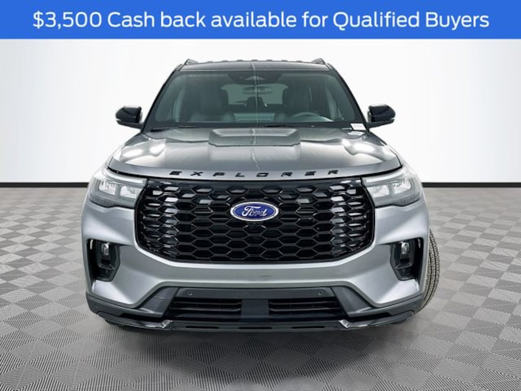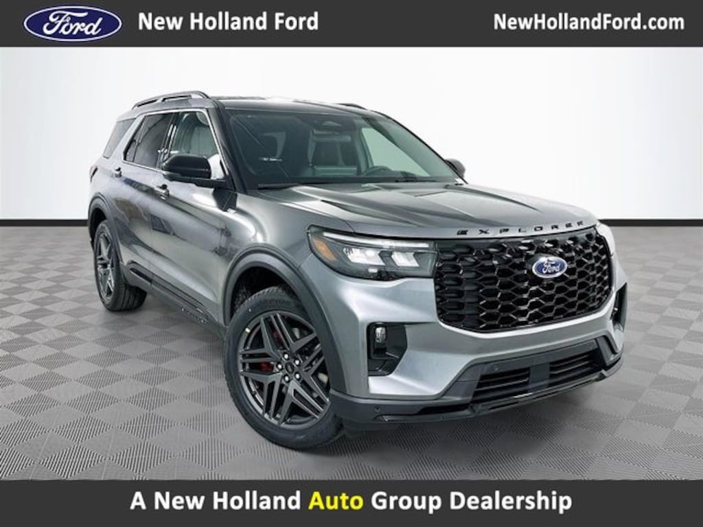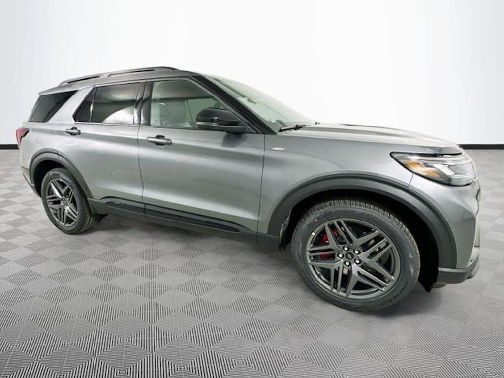 Gray 2026 Ford Explorer ST-Line 4WD 2.3L EcoBoost I-4 4D Sport Utility 10-Speed Automatic 4WD, 10 Speakers, 3rd row seats: bench, 4-Wheel Disc Brakes, ABS brakes, Air Conditioning, Alloy wheels, AM/FM radio: SiriusXM with 360L, Apple CarPlay/Android Auto, Auto High-beam Headlights, Automatic temperature control, Brake assist, Bumpers: body-color, Compass, Delay-off headlights, Driver door bin, Driver vanity mirror, Dual front impact airbags, Dual front side impact airbags, Electronic Stability Control, Emergency communication system: 911 Assist, Exterior Parking Camera Rear, Four wheel independent suspension, Front anti-roll bar, Front Bucket Seats, Front Center Armrest, Front dual zone A/C, Front fog lights, Front reading lights, Fully automatic headlights, Garage door transmitter, Heated door mirrors, Heated front seats, Heated steering wheel, Heated Unique Cloth Captain's Chairs, Illuminated entry, Knee airbag, Leather steering wheel, Low tire pressure warning, Navigation System, Occupant sensing airbag, Outside temperature display, Overhead airbag, Overhead console, Panic alarm, Passenger door bin, Passenger vanity mirror, Power door mirrors, Power driver seat, Power Liftgate, Power passenger seat, Power steering, Power windows, Radio: B&O Sound System by Bang and Olufsen, Rear air conditioning, Rear anti-roll bar, Rear reading lights, Rear window defroster, Rear window wiper, Remote keyless entry, Security system, Speed control, Speed-sensing steering, Speed-Sensitive Wipers, Split folding rear seat, Spoiler, Steering wheel mounted audio controls, Tachometer, Telescoping steering wheel, Tilt steering wheel, Traction control, Trip computer, Variably intermittent wipers, Wheels: 20" Ebony-Painted Machined Aluminum, 4WD.