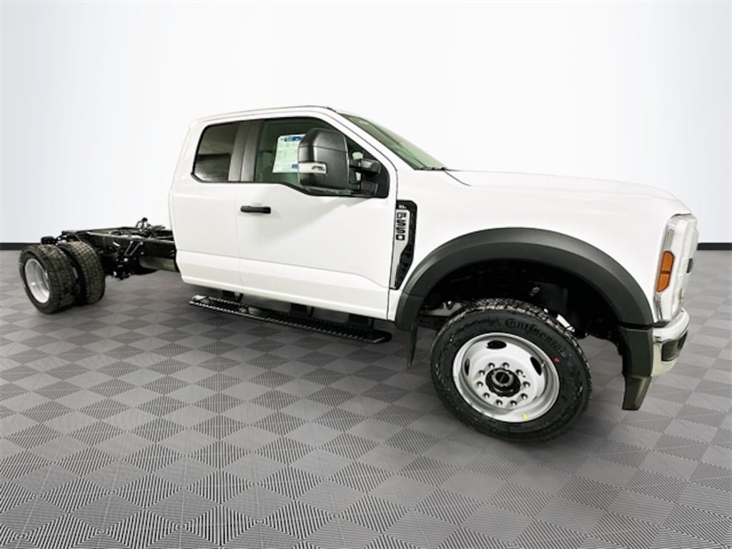Oxford White 2026 Ford F-550SD XL DRW 4WD 7.3L V8 PFI OHV 16V Federal 335hp Super Cab 10-Speed Automatic 4WD, 190 Amp Alternator, 250 Amp Alternator, 4-Wheel Disc Brakes, 6 Speakers, ABS brakes, Air Conditioning, AM/FM radio, Brake assist, Bright Grille, Chrome Front Bumper, Compass, Delay-off headlights, Dual front impact airbags, Dual front side impact airbags, Dual rear wheels, Emergency communication system: SYNC 4 911 Assist, Ford Connectivity Package (1-Year Included), Front anti-roll bar, Front Center Armrest w/Storage, Front License Plate Bracket, Front reading lights, Fully automatic headlights, GVWR: 18,000 lbs Payload Package, GVWR: 19,550 Lb Payload Plus Upgrade Package 2, Halogen Fog Lamps, HD Vinyl 40/20/40 Split Bench Seat, Heated door mirrors, Illuminated entry, Internet access capable: 5G Modem - Ford Connectivity Package, Low tire pressure warning, Order Code 660A, Outside temperature display, Overhead airbag, Overhead console, Panic alarm, Passenger cancellable airbag, Passenger vanity mirror, Platform Running Boards, Power door mirrors, Power steering, Power windows, Privacy Glass with Power Sliding Rear Glass, Radio: AM/FM Stereo with MP3 Player, Rear anti-roll bar, Rear View Camera and Prep Kit, Rear Window Defroster, Remote keyless entry, Remote Start, Security system, Snow Plow Prep Package, Speed control, Split folding rear seat, Steering wheel mounted audio controls, SYNC 4, Tachometer, Telescoping steering wheel, Tilt steering wheel, Traction control, Trailer Brake Controller, Trip computer, Turn signal indicator mirrors, Variably intermittent wipers, Wheels: 19.5" x 6" Argent Painted Steel, XL Chrome Package, 4WD.
